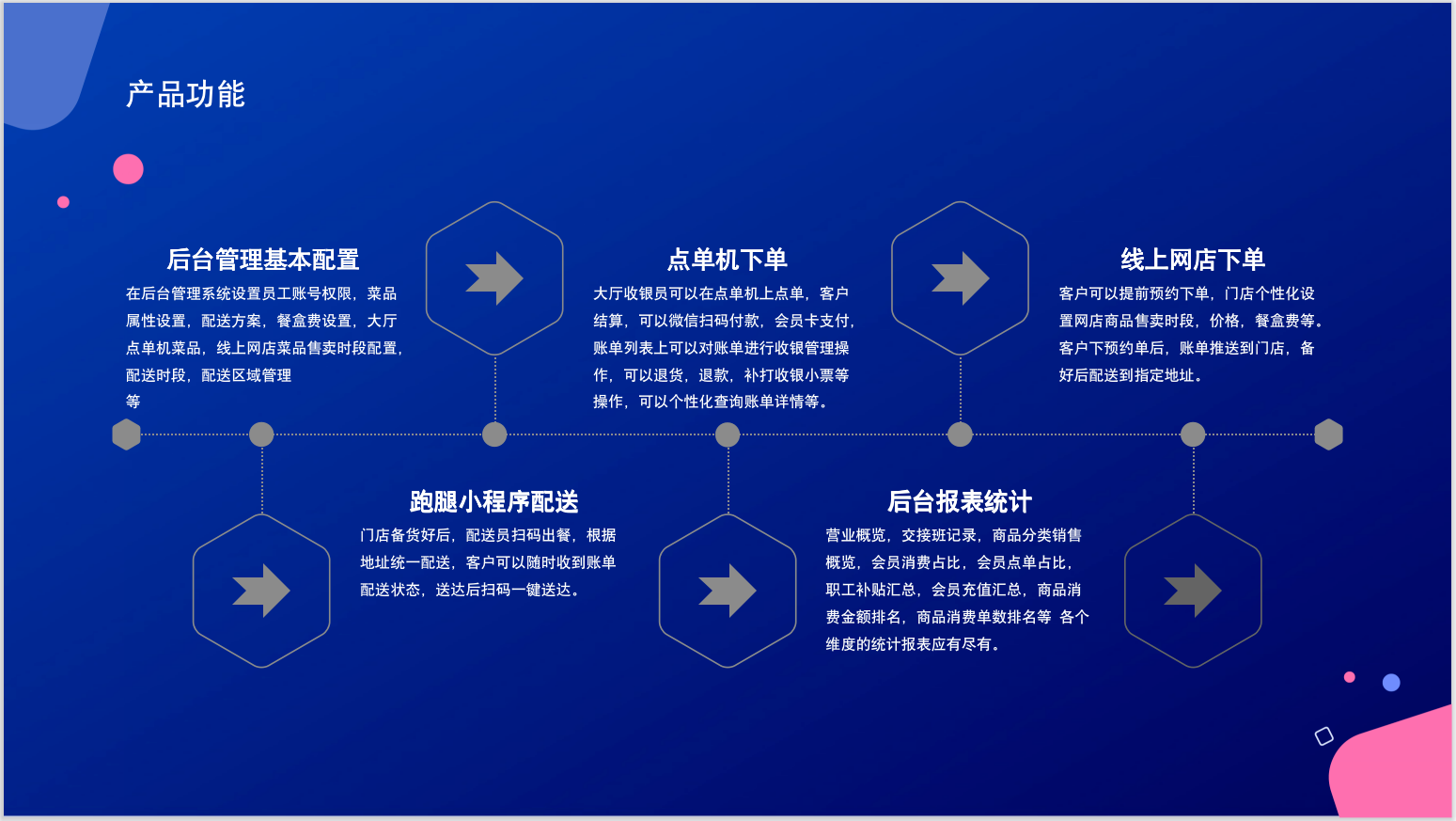 HELLO餐廳系統主要(yào)包含四個(gè)端,後台管理(<ε£lǐ)端,安卓點單收銀(yín)端,公衆号線上(shàng)商城(chéng≥λ£),跑腿配送小(xiǎo)程序。四端集一(yī)體★ ↔(tǐ),數(shù)據互通(tōng),相←↔★(xiàng)互串聯,便捷于用(yòng)戶在各個(gè)∏&"維度上(shàng)的(de)适用(yòng)。